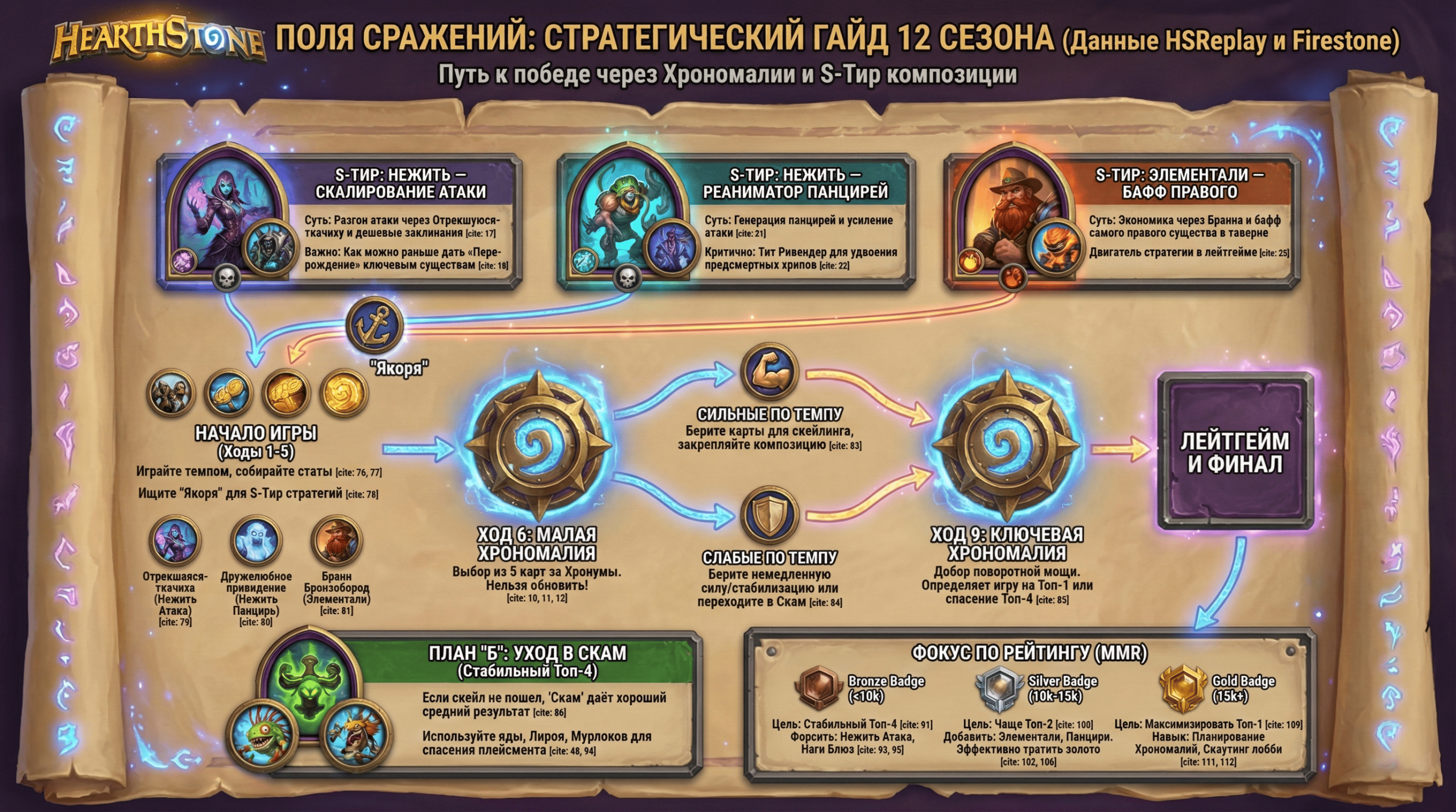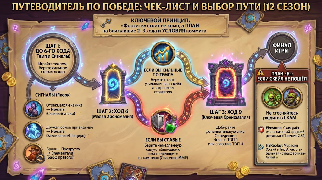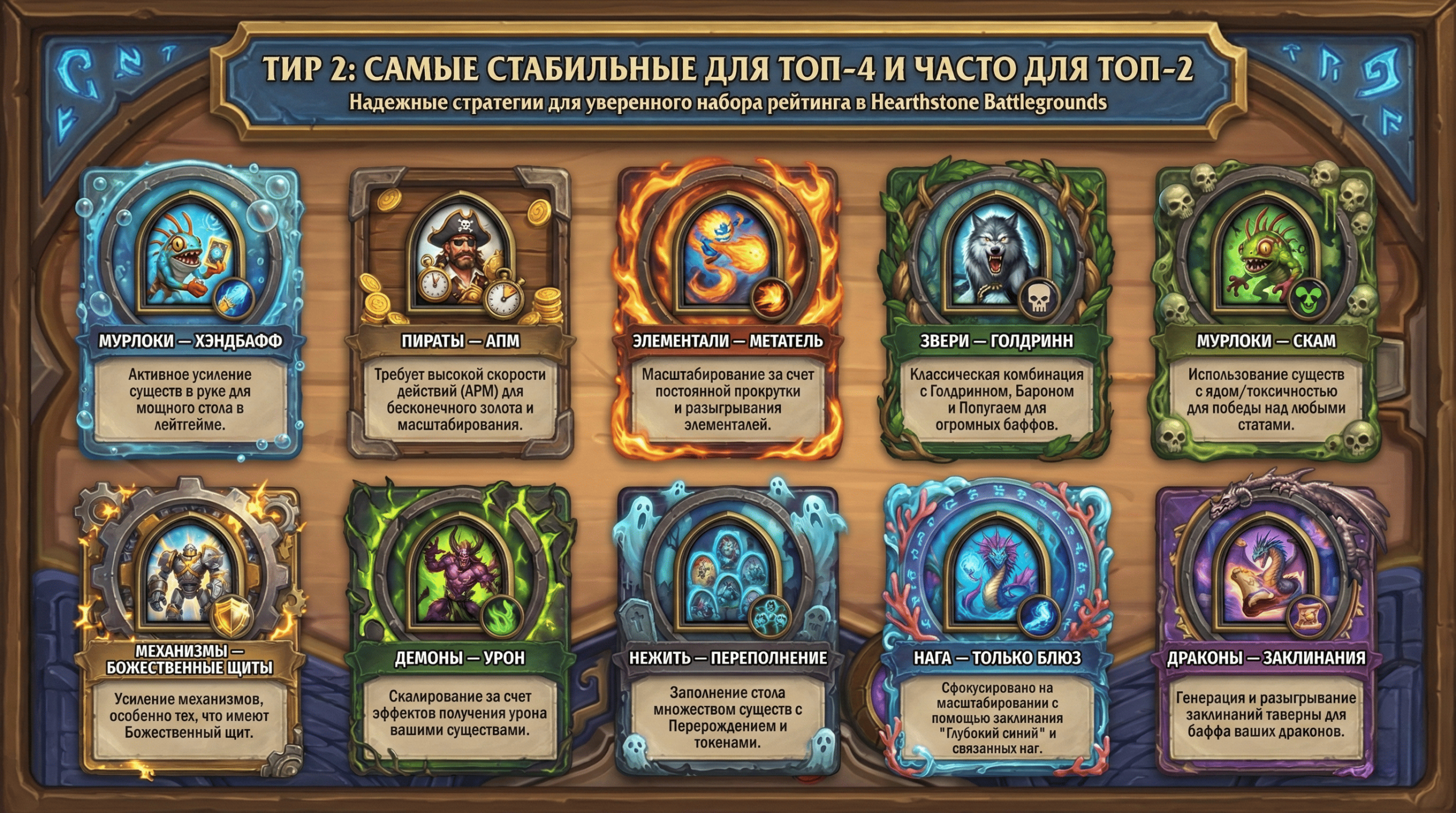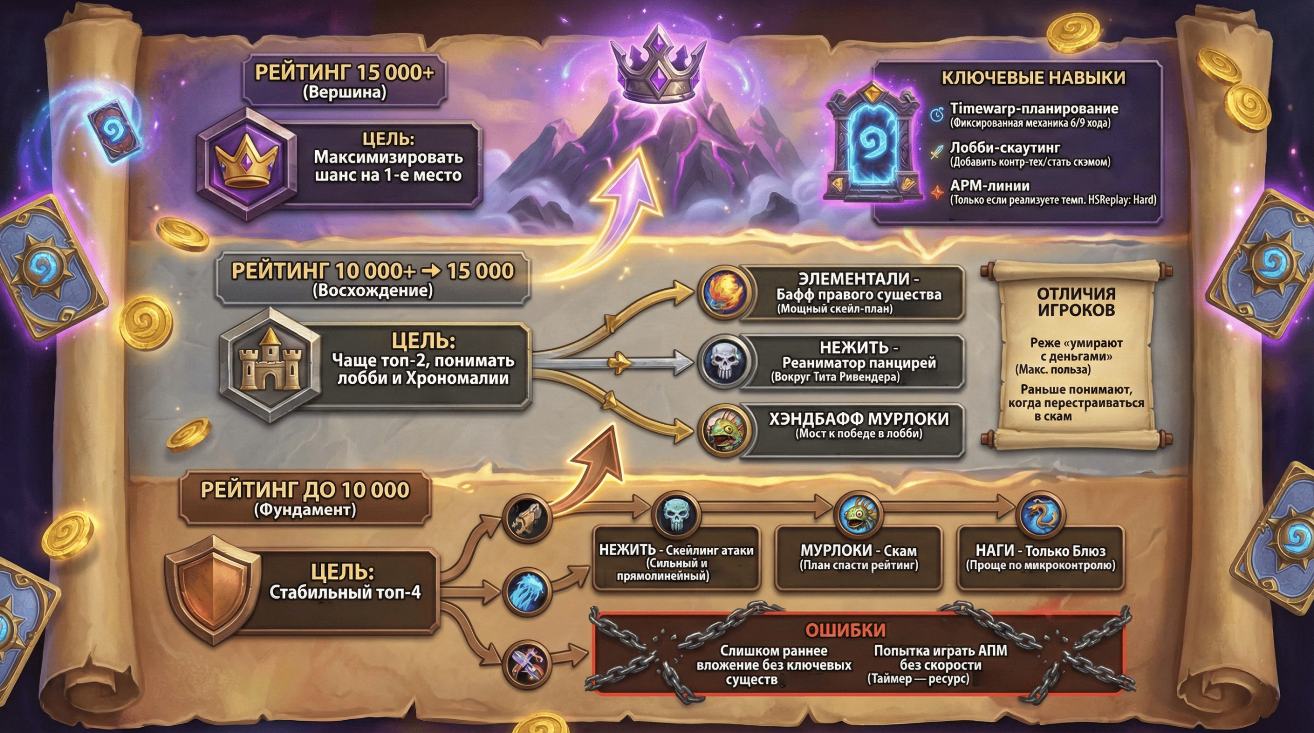 - Цель: Чаще брать топ‑2 (вместо топ-4), начать лучше «читать» лобби и правильно понимать, что брать в Хрономальной таверне.