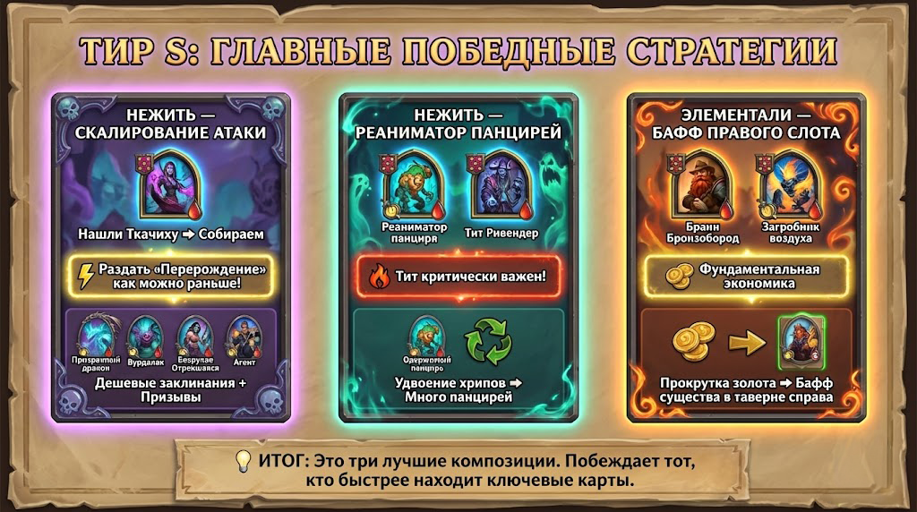 Способ выиграть: Через экономику, бесконечный поток элементалей и усиление самого правого существа в таверне через Загробника воздуха. Сигналы, что можно собирать: Ранний Бранн, хорошие условия для постоянного цикла (золото -> токены -> дешёвые покупки/продажи).