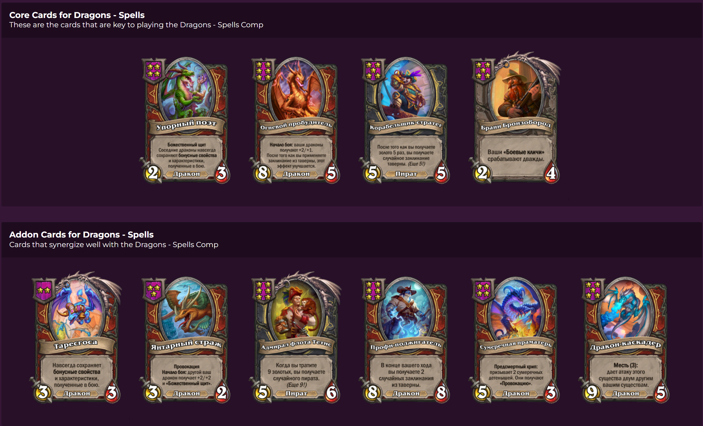 - Драконы — Заклинания: Огненный пробудитель является основой стратегии, позволяя «крутить» заклинания таверны. Важно найти Упорного поэта, чтобы усиления от Пробудителя не уходили в пустоту.
