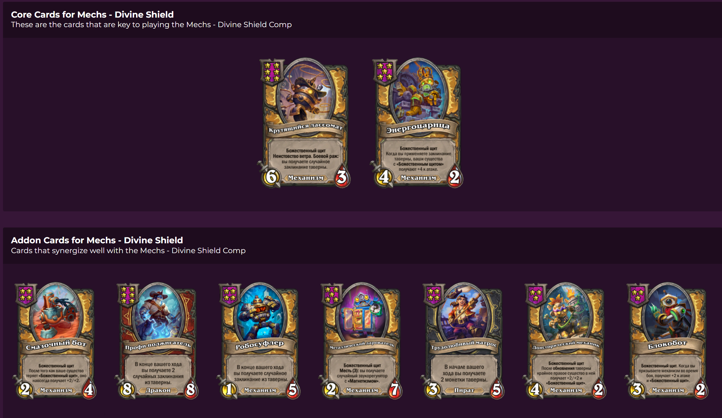 - Механизмы — Божественные щиты: Простая стратегия, где вы активно баффаете механизмы с божественными щитами. Энергоцарица и Смазочный бот дополнительно усиливают таких существ.