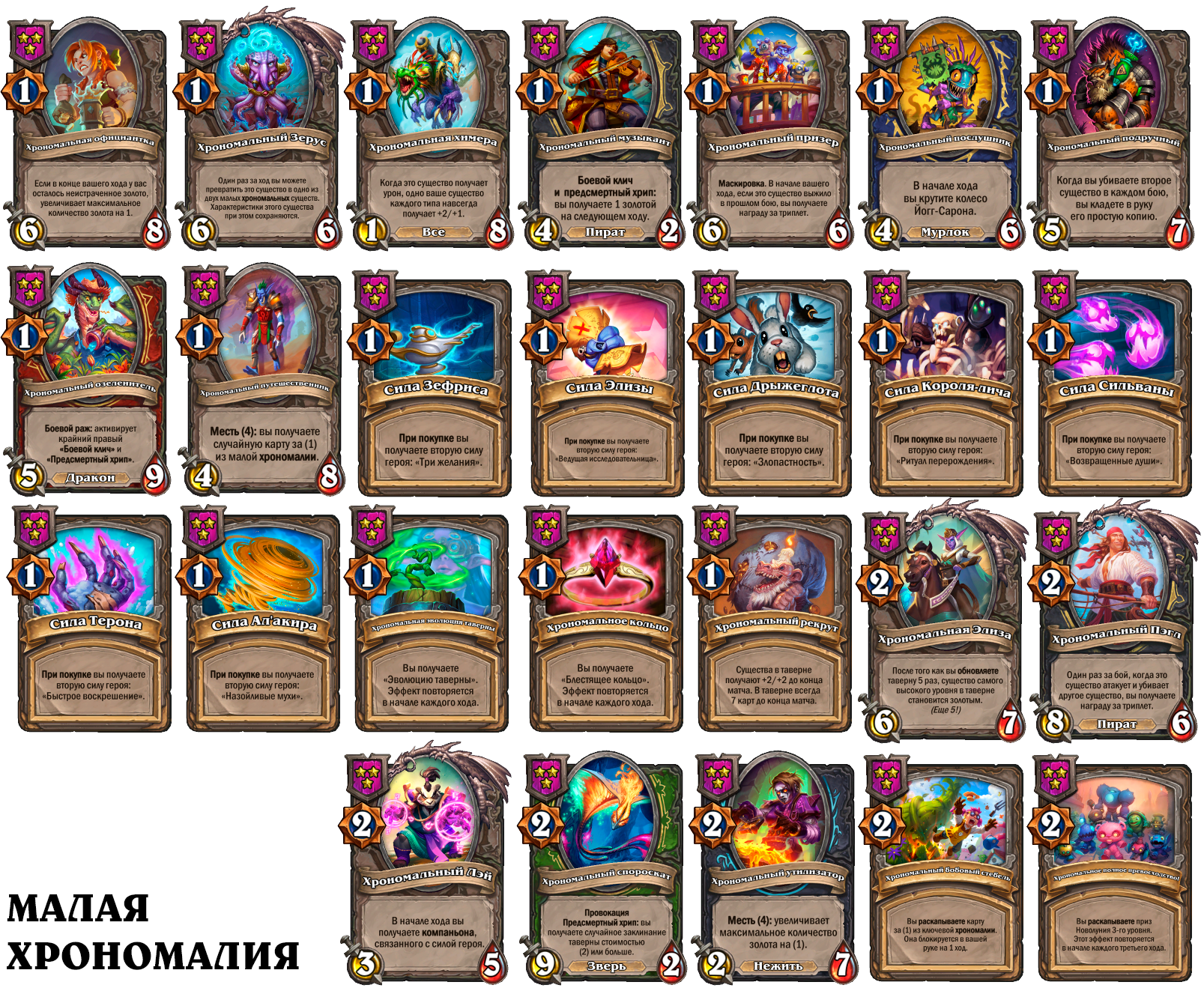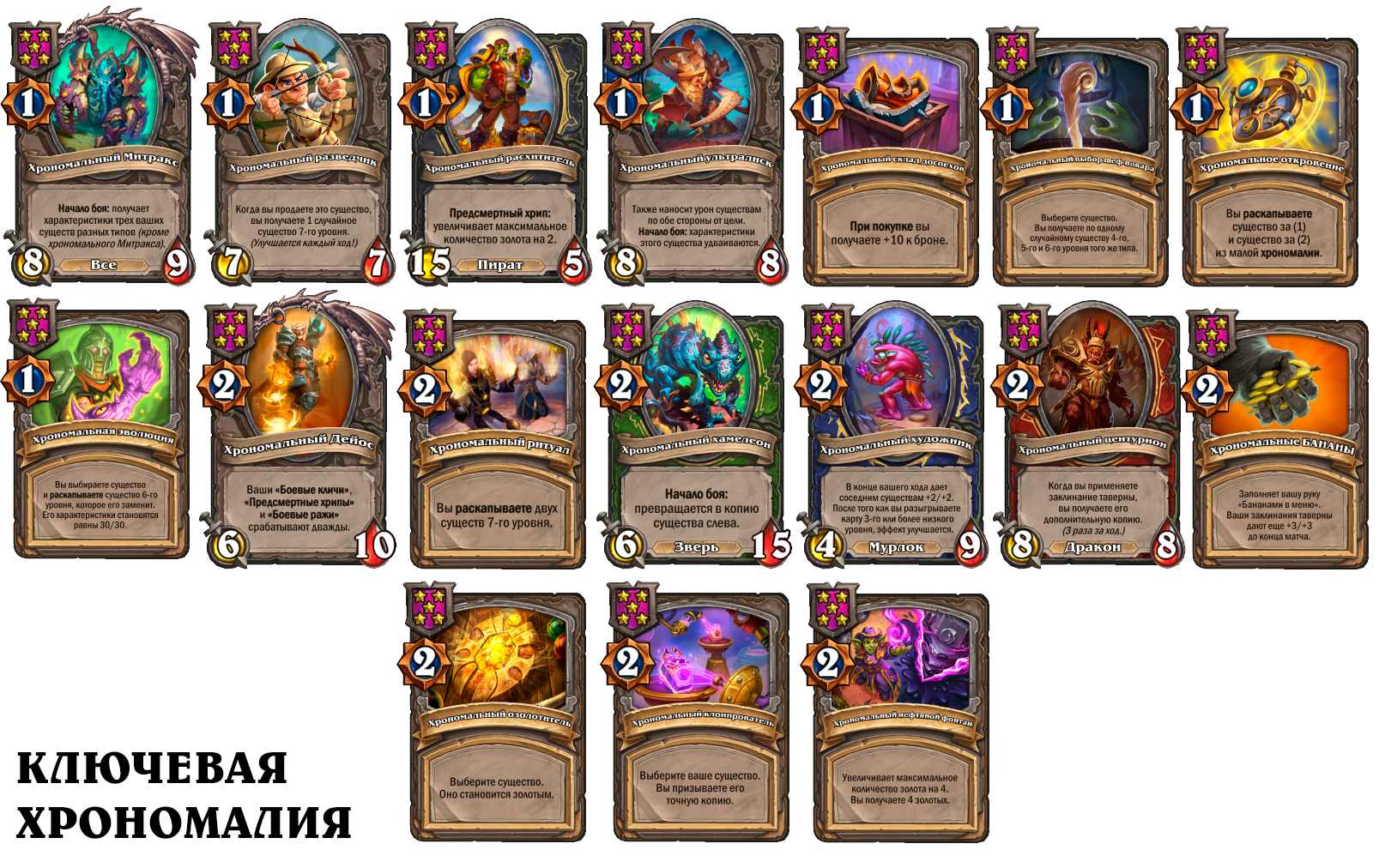 Хрономальная таверна довольно сильно изменила привычный ход игры. Теперь у вас есть две возможности за партию, чтобы гарантированно получить полезные ресурсы или усилить свой стол. Выше представлен список всех универсальных хрономальных карт, которые помогут вам адаптироваться к ситуации и стабилизировать свою позицию.