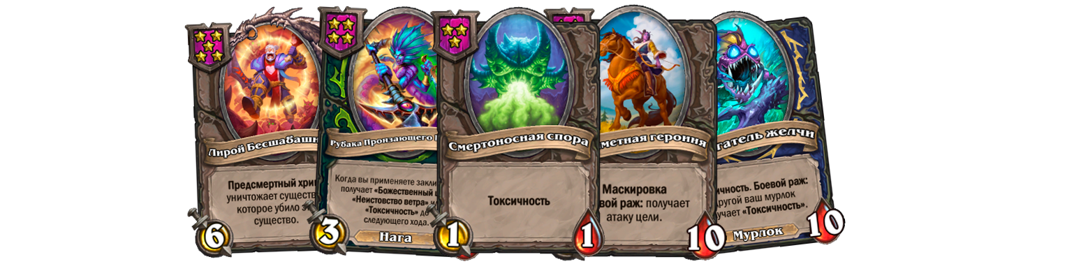 Это простая стратегия, которая строится на существах с Ядом и аналогичных механиках. Выше представлен список оптимальных карт для данной стратегии. Старайтесь использовать возможности Хрономальной таверны или силу героя Короля-лича, чтобы дать Лирою эффект Перерождения.