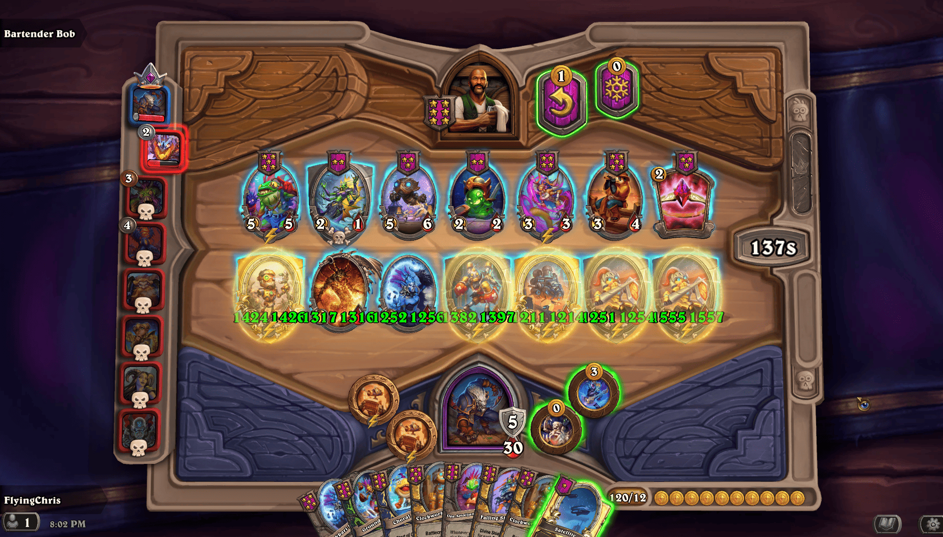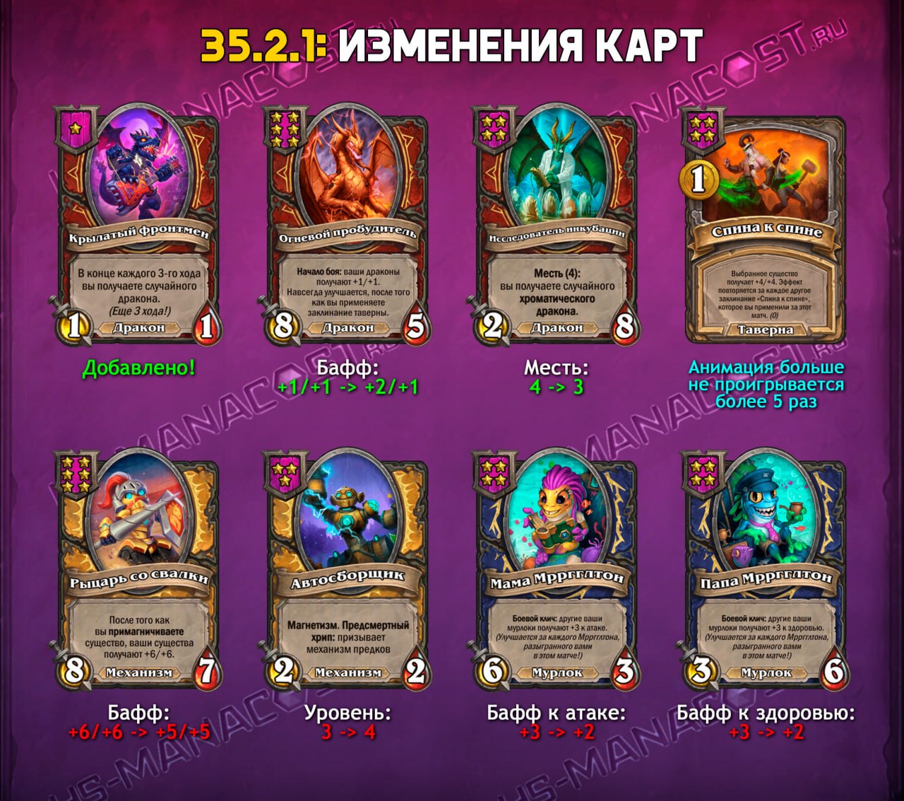 Ослабление мурлоков для автора оказалось довольно удивительным. На фоне пиратов и демонов я все же считал, что мурлоков изменения обойдут стороной, но этого не произошло. И Папе, и Маме Мрргглтону снизили усиление от боевого клича на одну единицу. Если раньше прирост шел по схеме 3–6–9–12–15 и далее, то теперь это 2–4–6–8–10. Таким образом, усиление будет происходить медленнее, что немного снизит эффективность стратегии на фоне тех же демонов. Также разработчики повысили стоимость очень важного тринкета Наклейка с Юным Мрачноглазом — с 1 до 4, а он был важен для этой стратегии.