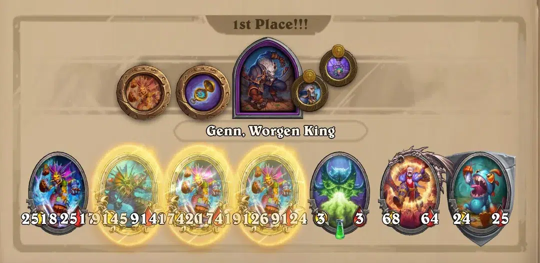 Сначала пройдемся по существам, чтобы рассмотреть конкретные тренды, которые хотели донести разработчики. Сперва можно увидеть усиление Огненного пробудителя и Исследователя инкубации, то есть прямой бафф драконов. Повлияло ли это как-то на положение драконов в мете? Не особо. Проблема драконов сейчас не в характеристиках, а в том, что у нас почти нет четких и сильных стратегий. Да, можно собрать стол через Калесгоса или того же Огненного пробудителя, но эти варианты остаются слабыми и очень медленными. Обе концепции нужно не только собрать, что уже дорого, но и затем раскачивать еще не один ход. Как мы уже не раз отмечали в прошлых мета-отчетах, сейчас мета динамичная, и стратегии, которые строятся только вокруг существ шестого уровня таверны и при этом еще требуют дополнительного усиления, обречены на провал. Любопытно, что драконам уменьшили стоимость некоторых тринкетов, но мы сомневаемся, что это повлияет на их положение в мете.