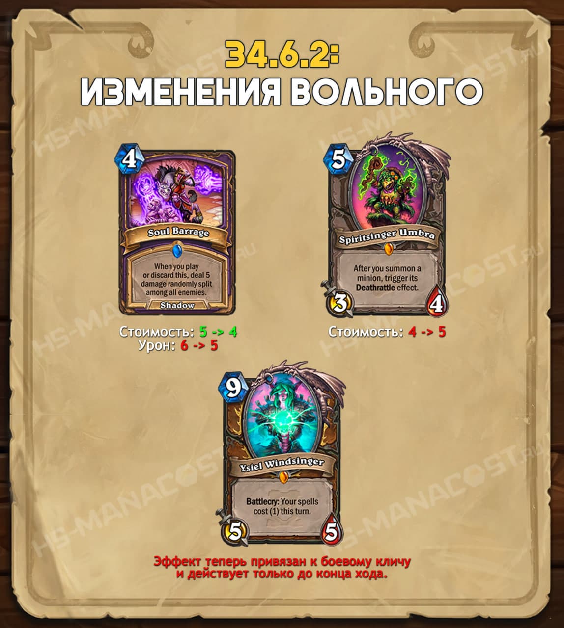 И на последнее разработчик решил так же прикончить фактически всех Комбо Друидов лишив Исель ауры и дав ей вместо этого боевой клич. тем самым игроки больше не могут проворачивать мощные маначит комбинации посредством призыва Исель через Барнса или через Цветок беладонны. по итогу Друид на чемпионах азерота, через локации с спд и барнсом, через дунгара с малигосом, мехактун — все эти деки фактически перестают быть играбельными.