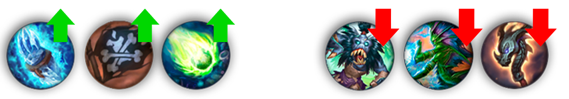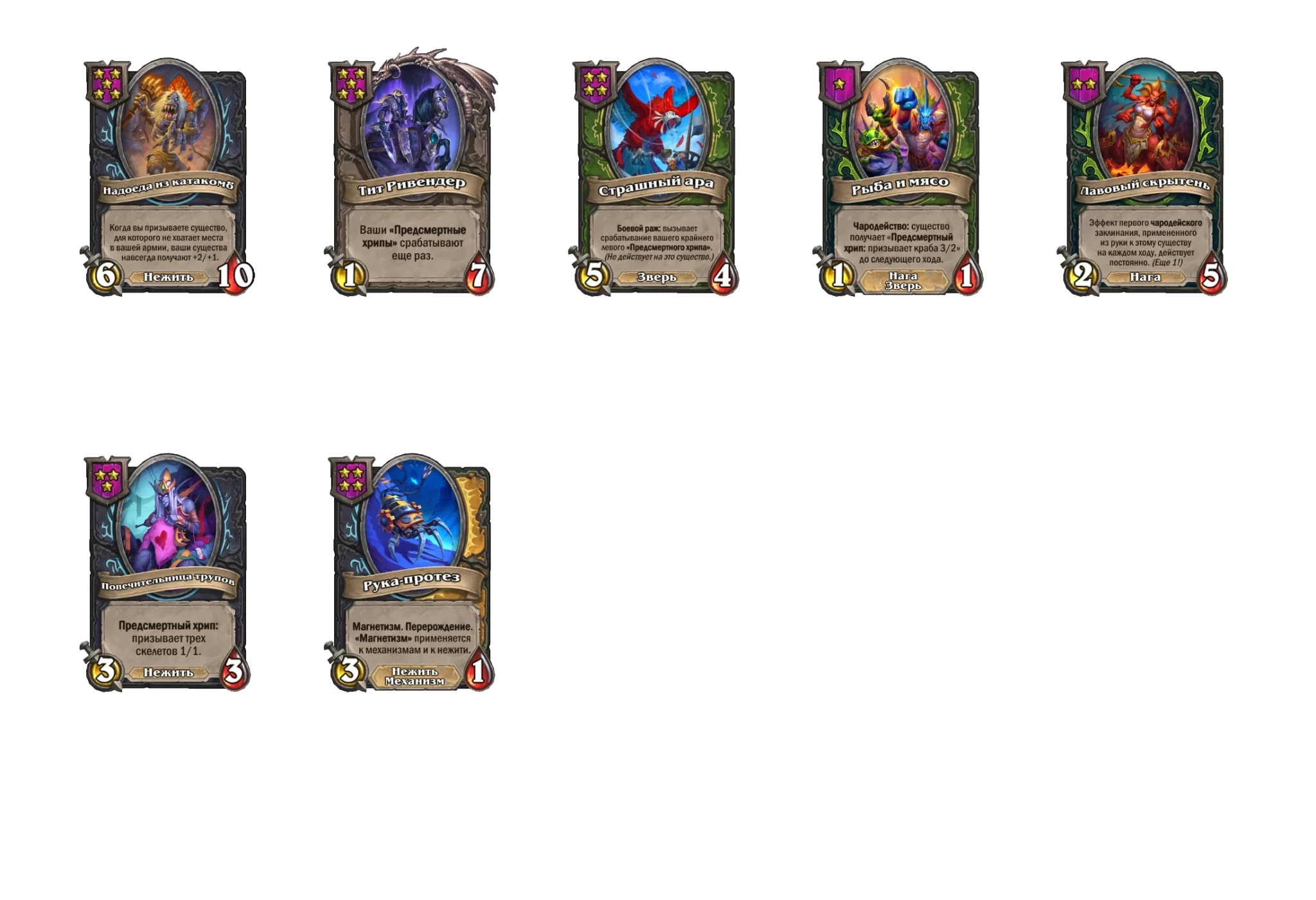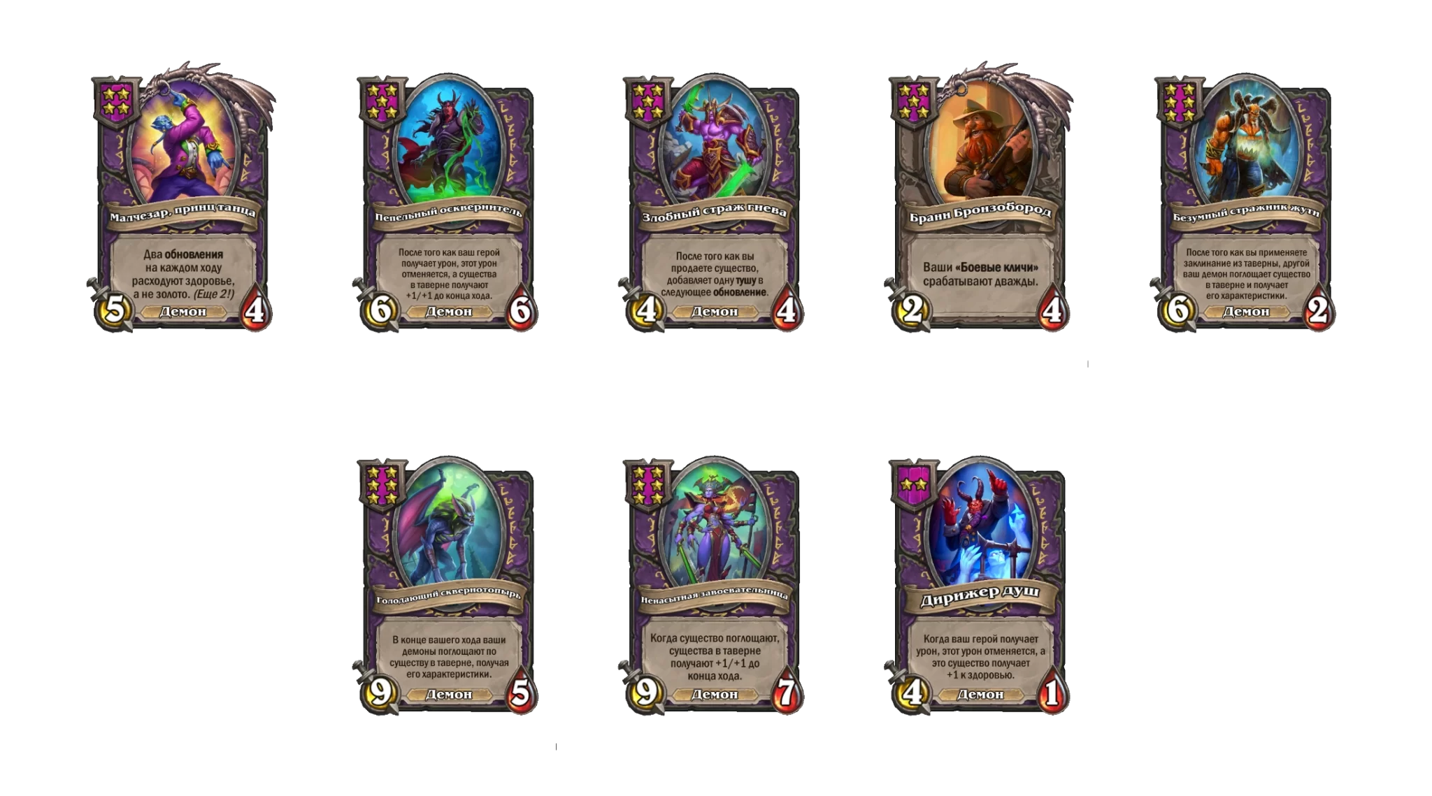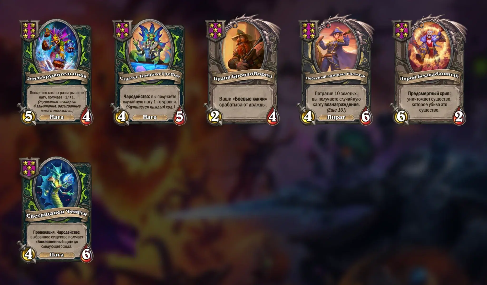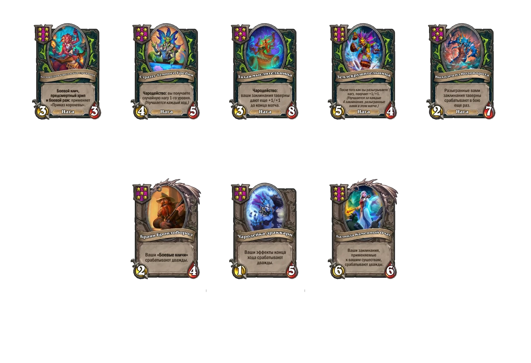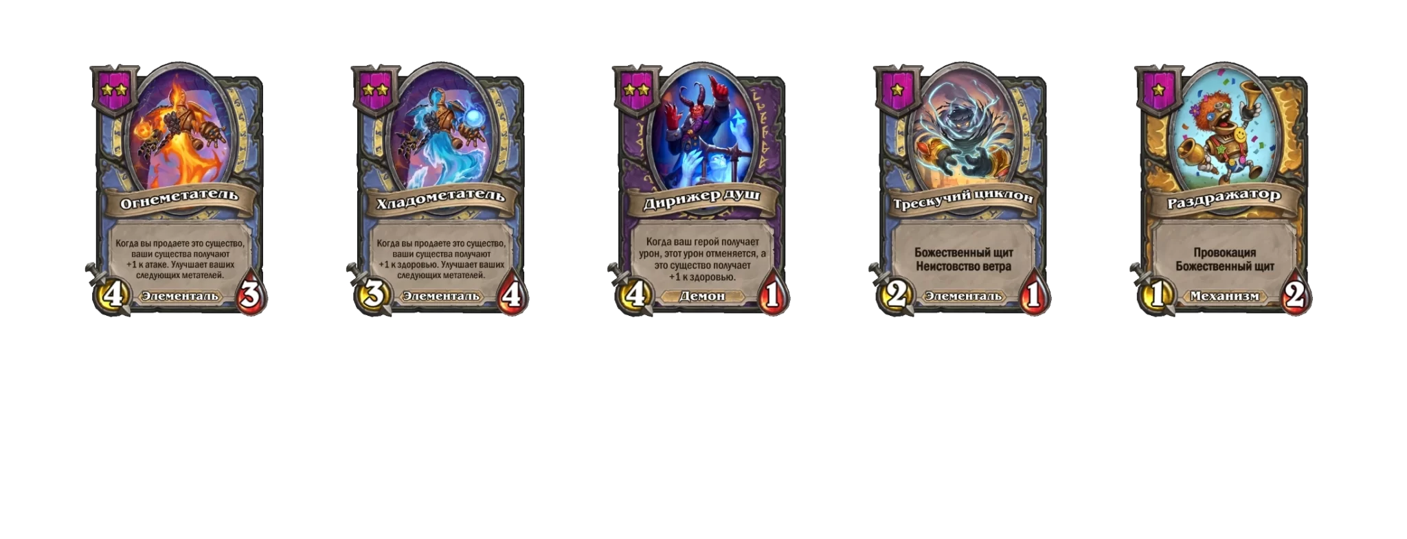 - Лучшие стратегии меты — Элементали с Чарами, APM пираты, демоны. Старайтесь форсировать эти типы существ с первых ходов, чтобы купить соответствующие Малые Аксессуары. Самые слабые стратегии меты — нежить, наги. Старайтесь не брать их в начале партии, чтобы под них не зашли Малые Аксессуары.
