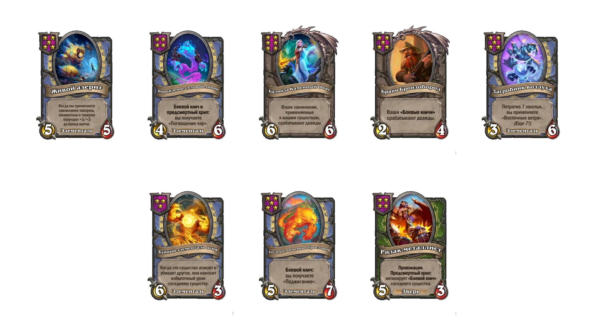 Элементали стали королями первого патча, но немного потеряли в эффективности из-за блокировки карты Светящееся лава. Тем не менее они всё ещё остаются сильной расой, и во многом это заслуга нового элементаля — Порождение силовой линии и заклинания Поглощение чар. Если вы находите этого элементаля и вовремя раскачиваете таверну, то довольно быстро выходите на отличный стол. Другие элементали, например Буйный элементаль огня или Трескучий циклон, тоже становятся хорошими целями для Поглощение чар.
