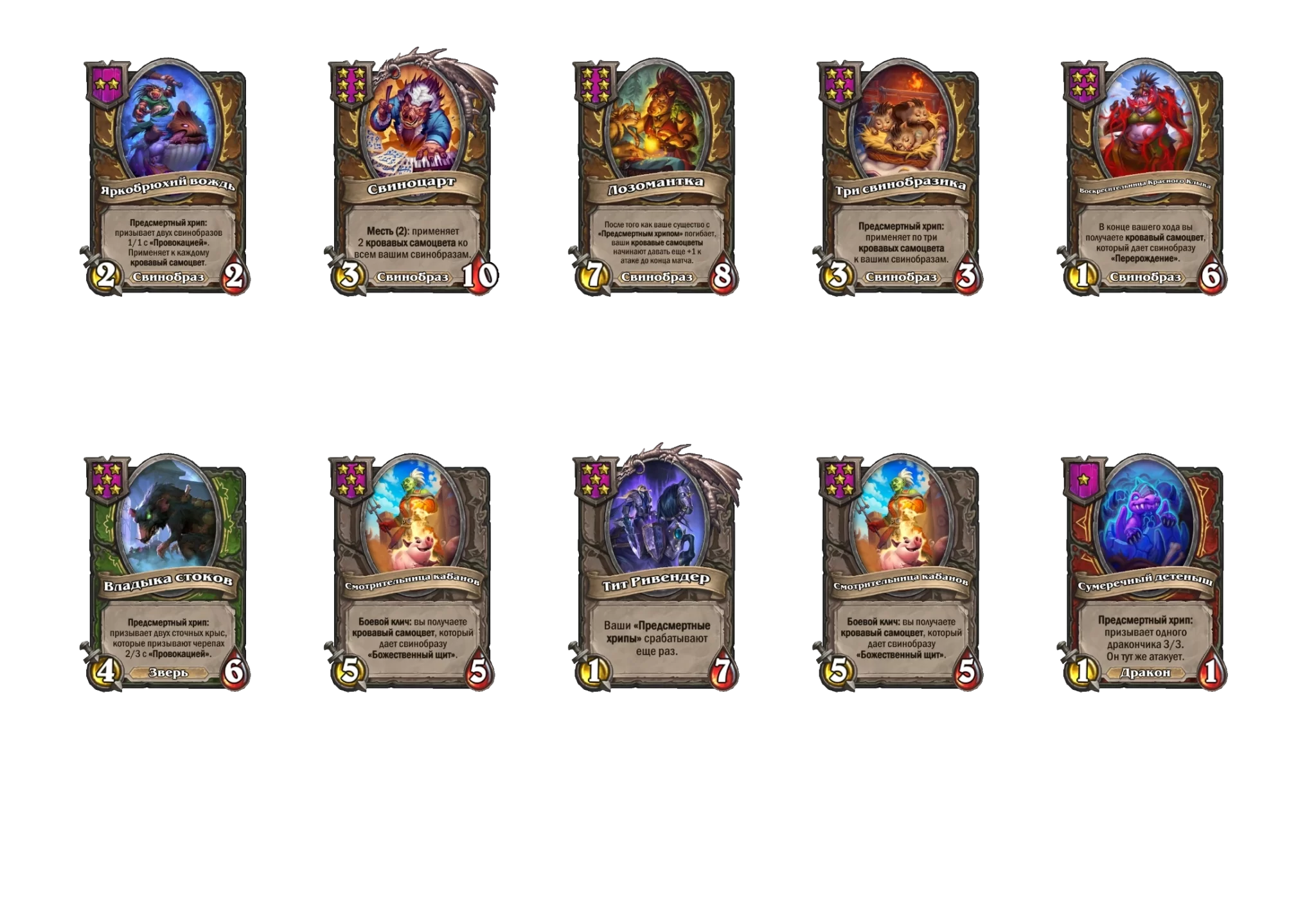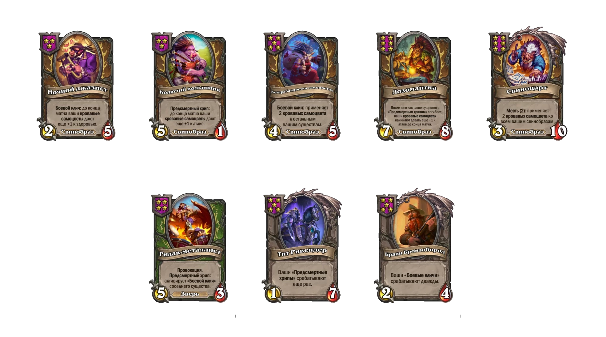 Свинобразы имеют две стратегии. Первая строится вокруг Контрабандиста, и именно она выглядит наиболее успешной. В этой сборке вы усиливаете свои самоцветы, а ключевой картой становится Контрабандистка самоцветов, которая хорошо сочетается с Рилаком Металлистом и Титом Ривендером. Всё это даёт вашему столу большое и стабильное усиление. Также можно сочетать Таресгосу и Свиноцарта, размещая их в правой части стола для максимального баффа.