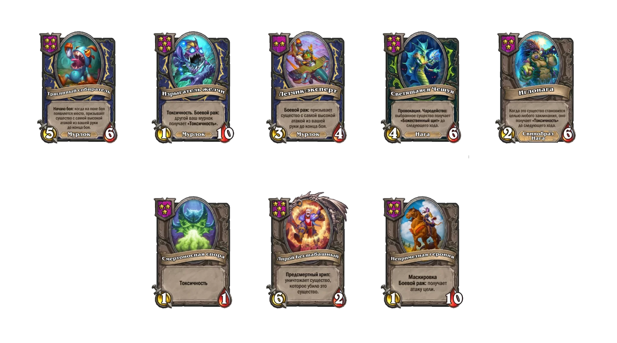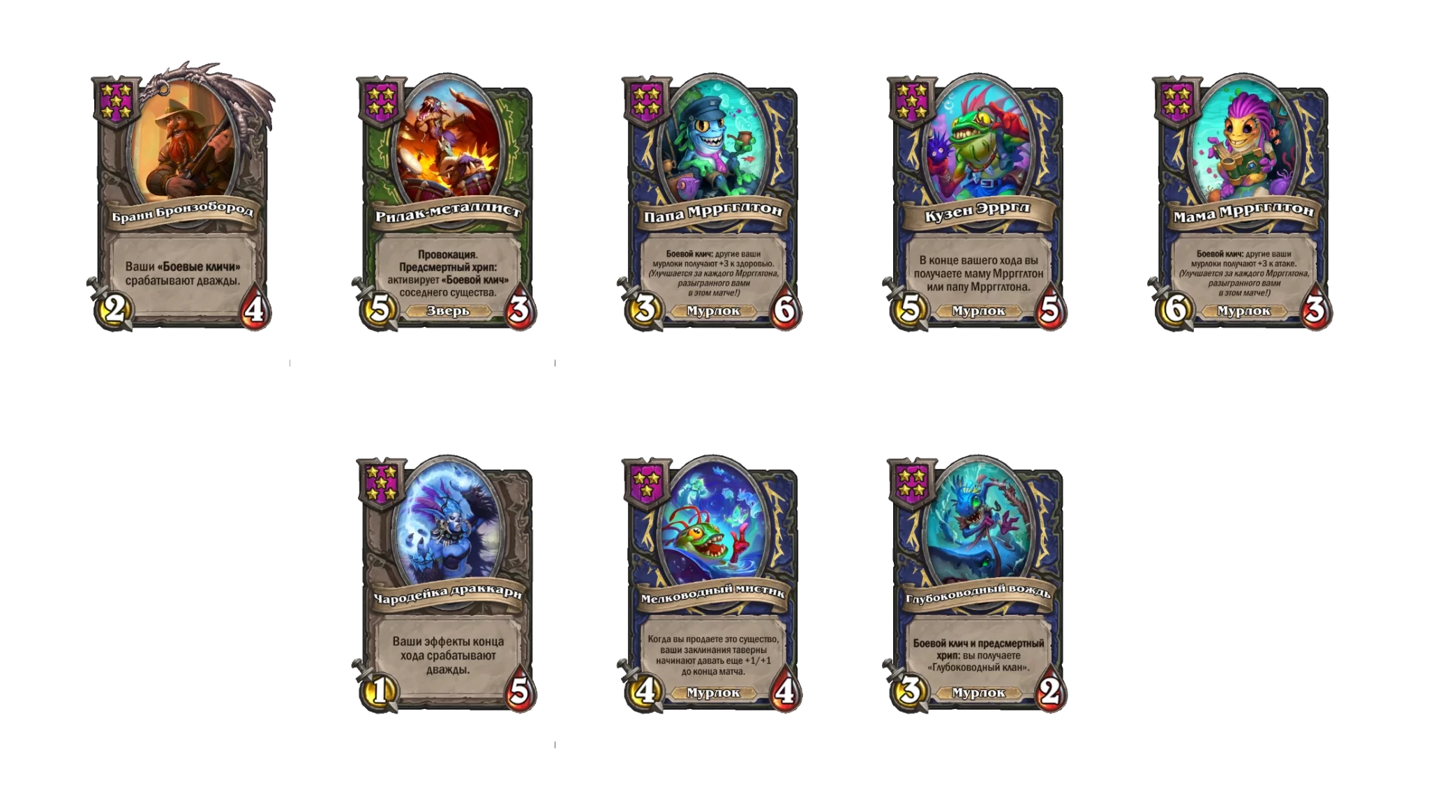 Мурлоки получили очередные карты, которые вы будете прокручивать с Бранном, а именно: Мама Мрргглтон, которая бафает вашему столу атаку, Папа Мрргглтон, который бафает здоровье, и Кузен Эрргл, который в конце хода даёт вам Папу или Маму. Да, тут действительно целая семейная драма. Их главная особенность, в отличие от прошлых похожих мурлоков, в том, что Папа и Мама улучшаются с каждым разыгрыванием. Что можно сказать об этой стратегии? Она неплохая: если вы находите Бранна или играете подходящим героем, то она может быть очень даже сильной. Если ориентироваться на статистику, то стратегия уверенно держится в тир-А, и, по сути, это вполне соответствует реальности. Мурлоки всё ещё обладают ядами, а значит, у них всегда есть шанс отлично показать себя.
