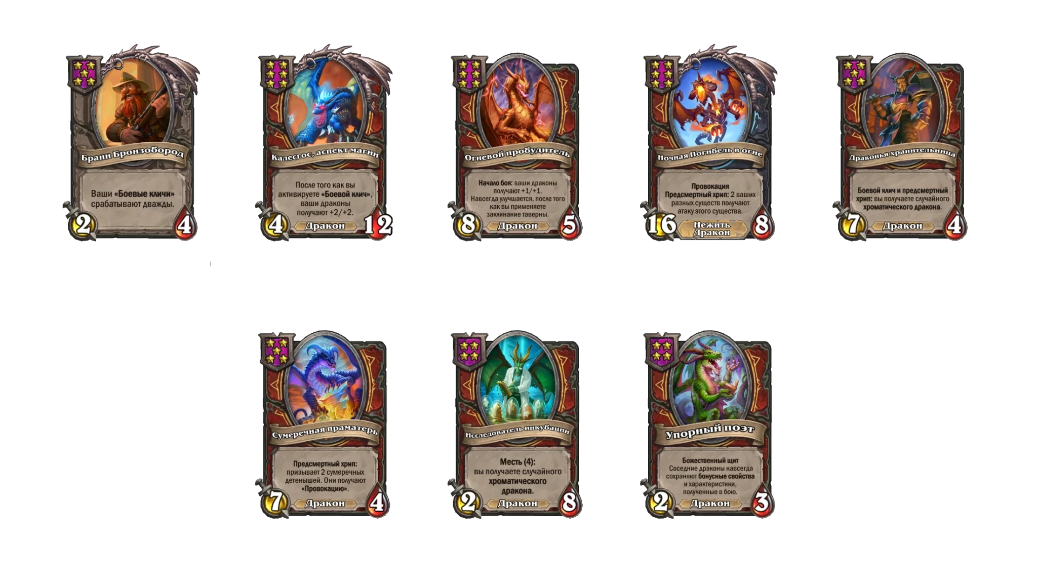 Интересно, что именно в этой стратегии Драконы смогли найти себе место. При хорошей раскрутке вознаграждений, которые являются заклинаниями таверны, вы можете взять Огненного пробудителя, Упорного поэта и Ночную погибель в огне. Это сочетание тоже позволяет получить очень сильных существ, которых затем можно эффективно усиливать.
