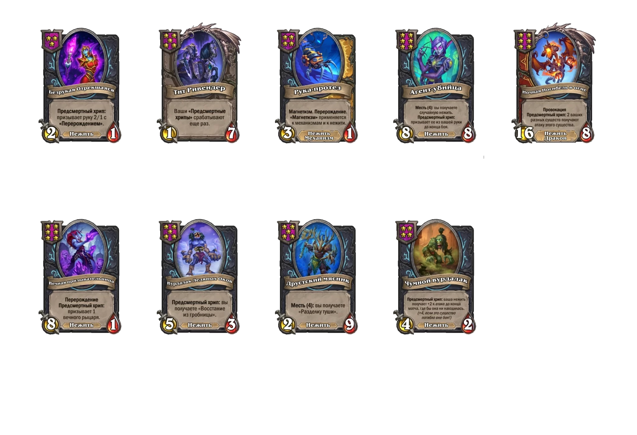 Нежить в этом патче выглядит ужасно, и, скорее всего, помочь ей сможет только следующий патч. Архетипу не добавили никаких действительно интересных инструментов: по сути, Нежить получила лишь пару карт для усиления атаки. Сейчас у неё есть только две стратегии, и обе находятся в глубине тир-С: Нежить через усиление атаки и Нежить через переполнение стола. Обе стратегии дорогие и слишком долго раскачиваются. Теоретически на низких рангах ещё можно попробовать вариант через усиление атаки, но в более серьёзном лобби это уже, скорее всего, не сработает.