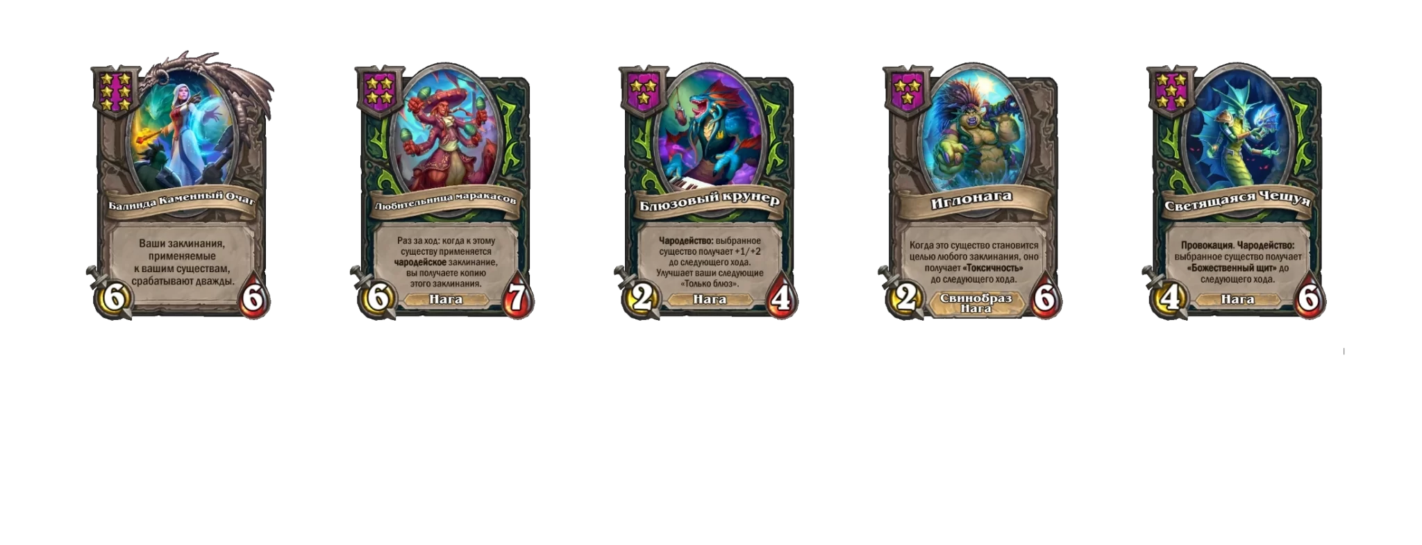 У Наг сейчас есть две стратегии: через новое существо T6, которое постоянно применяет Приказ королевы для усиления стола, и старая стратегия ещё из прошлого сезона через чародейское заклинание Только Блюз. Обе стратегии нельзя назвать по-настоящему сильными — скорее они слабее, чем сильнее, но всё же мы рассмотрим их немного подробнее.