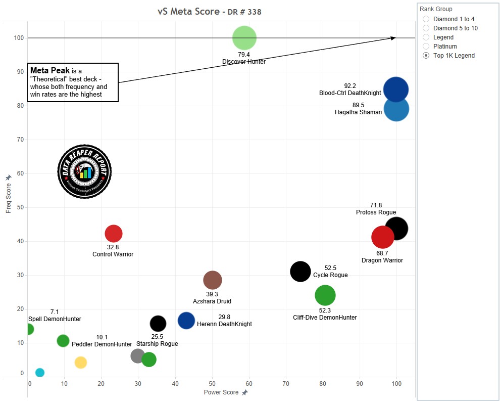 Исследовав этот график, вы сможете нагляднее увидеть и проще понять состояние текущей меты. Чем выше и правее находится определенная колода, тем более мощной и нездоровой для меты она является. В правом верхнем углу графика показан теоретический король меты — максимально сильный и максимально популярный. Можно пронаблюдать, как близко к нему подобрались существующие архетипы.