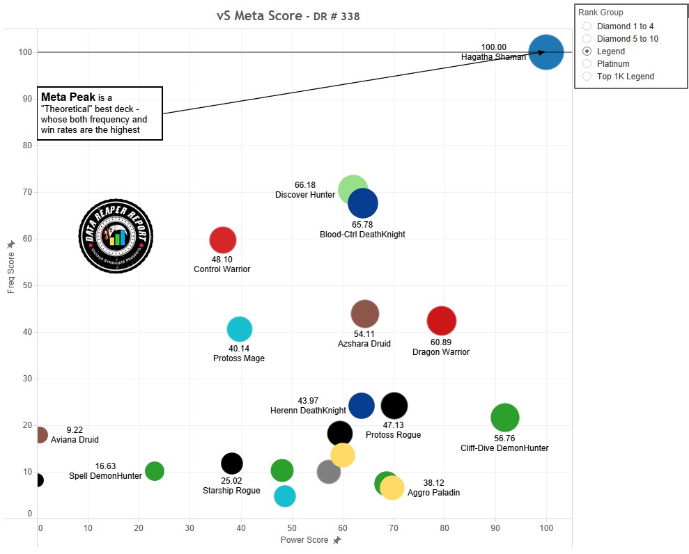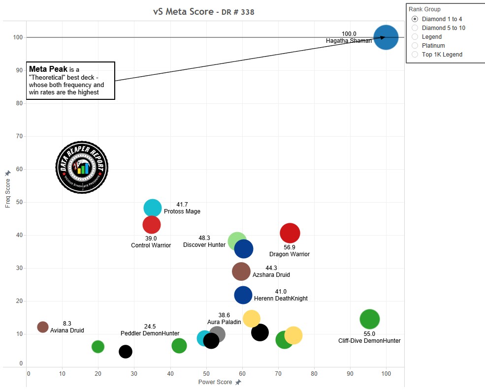 Оси диаграммы представляют оценку колод по шка ле от 0 до 100. Колода с наибольшим относительным винрейтом (см. предыдущую таблицу) получает оценку 100 по горизонтальной оси, а самая популярная — 100 по вертикальной. Оценку 0 получают колоды с противоположным значением от 50% винрейта/популярности. Например, если у сильнейшей колоды в мете 54% винрейта, то оценку 0 получат колоды с винрейтом 46%.