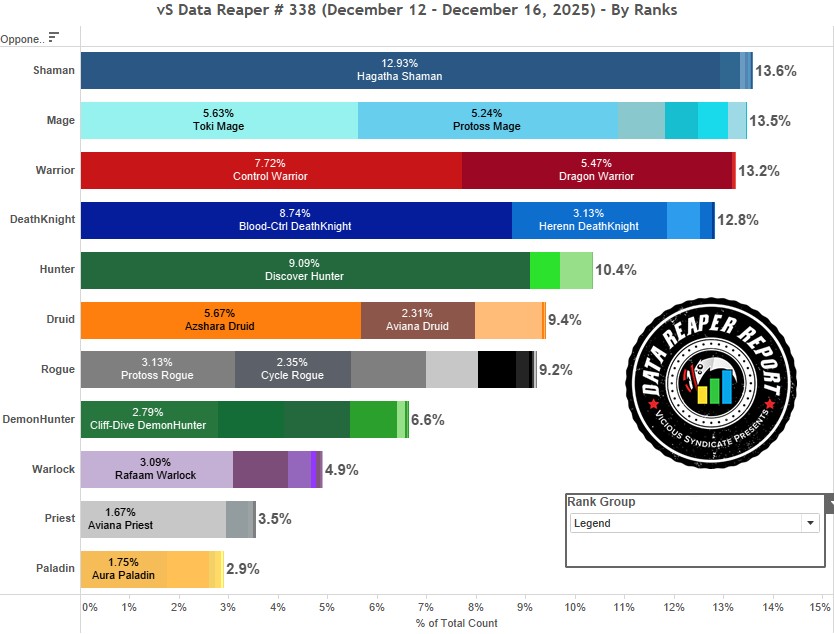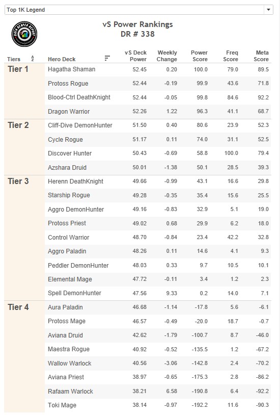 Миракл и Звездолет Разбойники стали встречаться чуть реже, в то время как число Протосс Разбойников выросло. Кроме того, в топе Легенды снова стали встречаться сборки Пеплошкурая/Фиракк Разбойника. Обратите внимание, что все сборки отображаются в статистике как один архетип, несмотря на то, что один из очень популярных вариантов не использует Фиракка. Пока неясно, как лучше всего назвать эту колоду — возможно, Элиза Разбойник. Разделять сборки, основываясь на картах, разыгранных противниками при сборе статистики, ненадежный подход, поскольку ранняя игра здесь всегда одинакова, а различия лежат лишь в конце кривой маны. Почти так же сложно разделять сборки Контроль ДК, который может играть Марина с Бескрайним простором или Наралекса с Фиракком.
