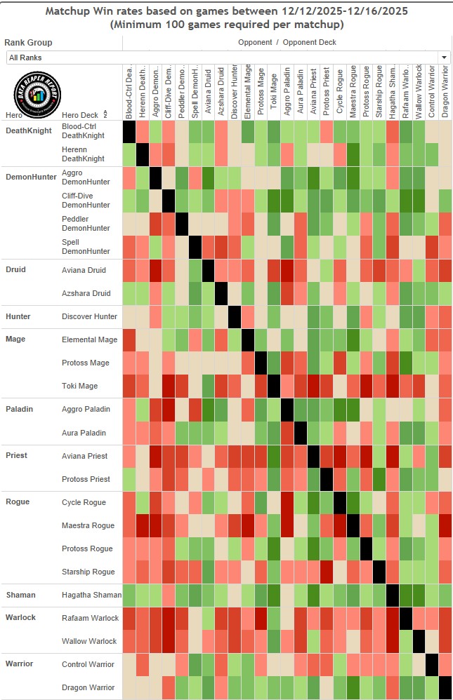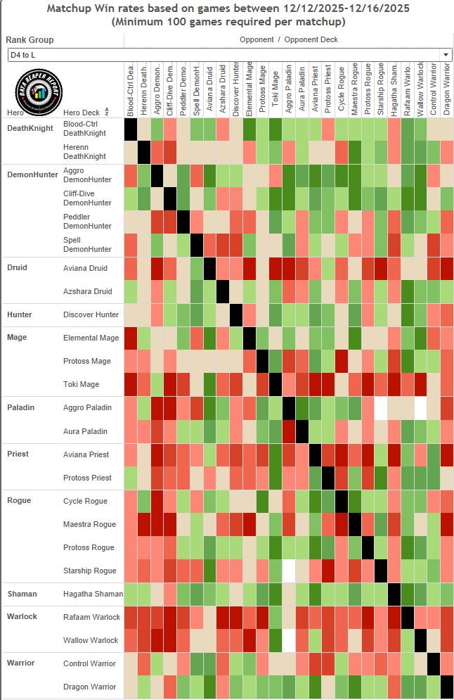 Контроль ДК очень силен. Сбалансированный разброс матч-апов без контр-колод — ситуация, похожая на Охотника на раскопке, но вместе с тем более высокий общий винрейт. Кроме того, Азшара Друид переключился на сборку, которая удобна для Контроль ДК. Геренн ДК неплох, но выглядит слабее.