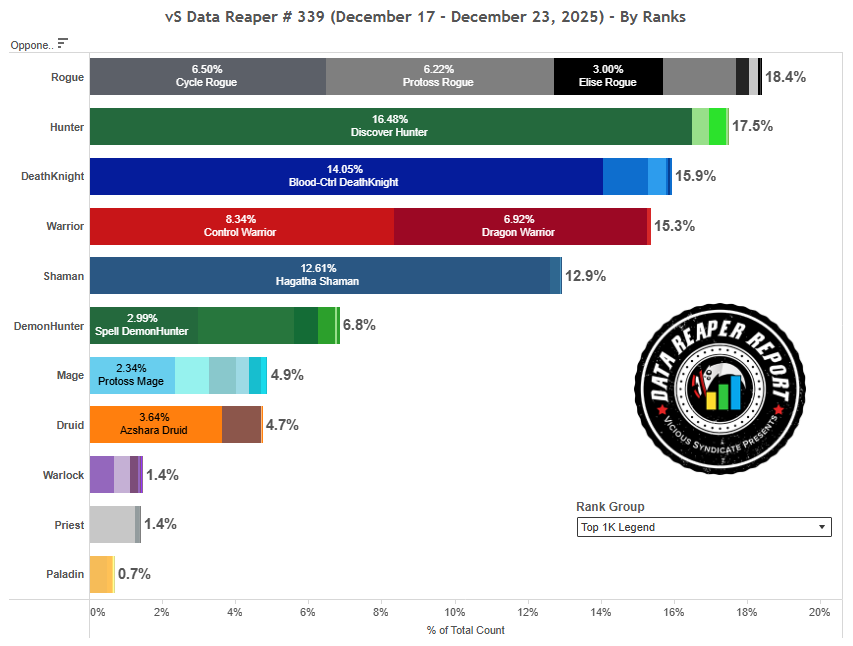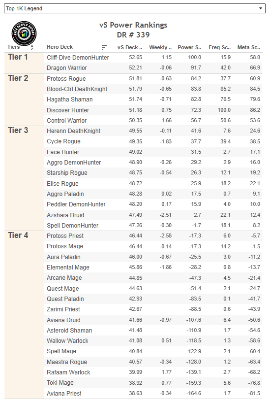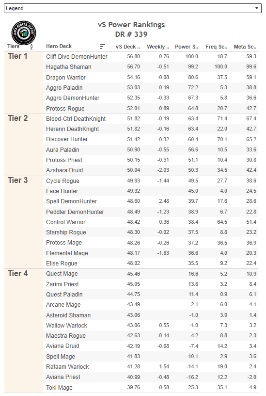 Охотник на раскопке, Контроль ДК, Квест Воин, Темпо Шамани Миракл Разбойник были самыми популярными колодами в турнире, причем с большим отрывом. Все они стали чаще встречаться в топе Легенды за последнюю неделю. Большинство колод, которые не были в центре внимания турнира, либо пошли на спад, либо не остались на прежнем месте.