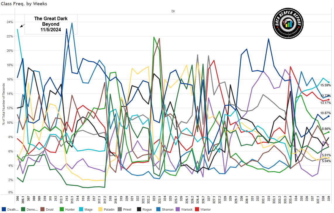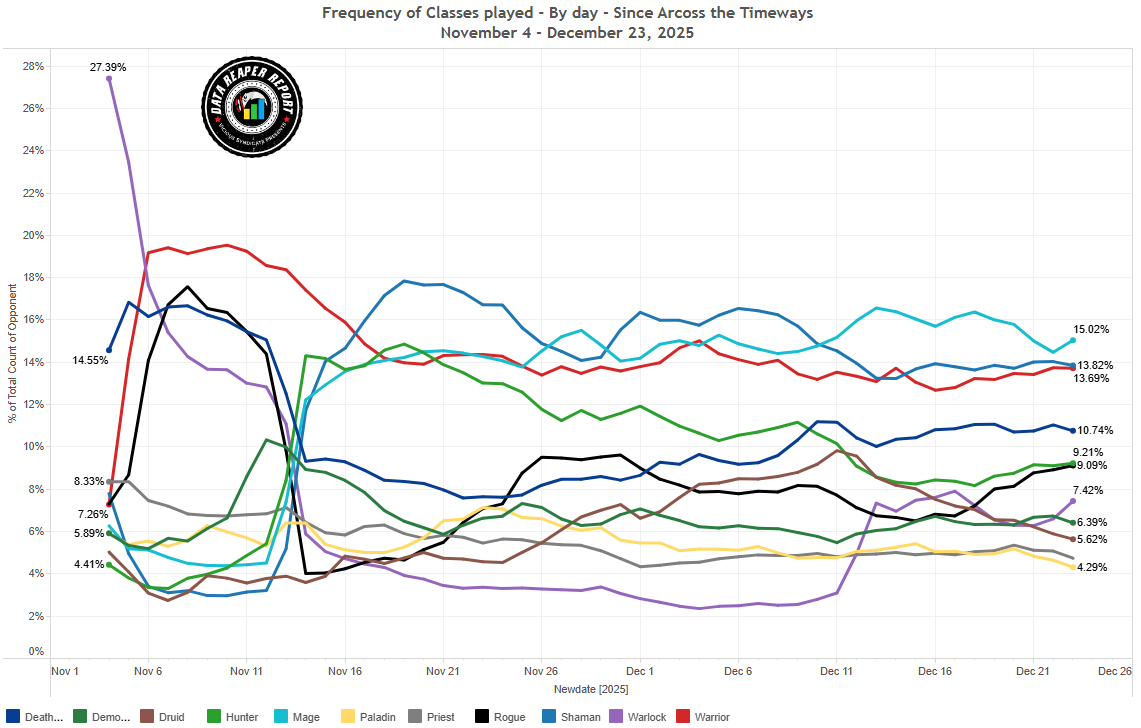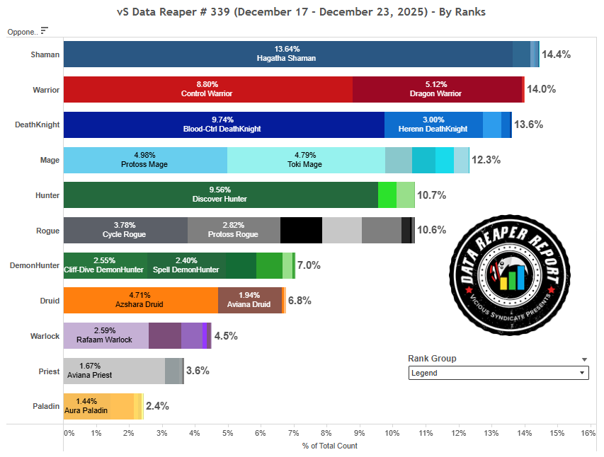 Однако, как и в большинстве ситуаций, топ Легенды — исключение, поскольку там игроки ведут себя существенно иначе. Здесь в этот раз основные изменения в популярности колод вызваны Чемпионатом мира по Hearthstone, нежели тенденциями ладдера. Игроки из топа Легенды наверняка следили за турниром и попытались перенести часть колод оттуда в рейтинговую игру. Хотя турнирная мета сильно отличается от ладдерной, и отдельно взятые колоды будут показывать себя лучше или хуже, впечатления от увиденного все равно берут верх.