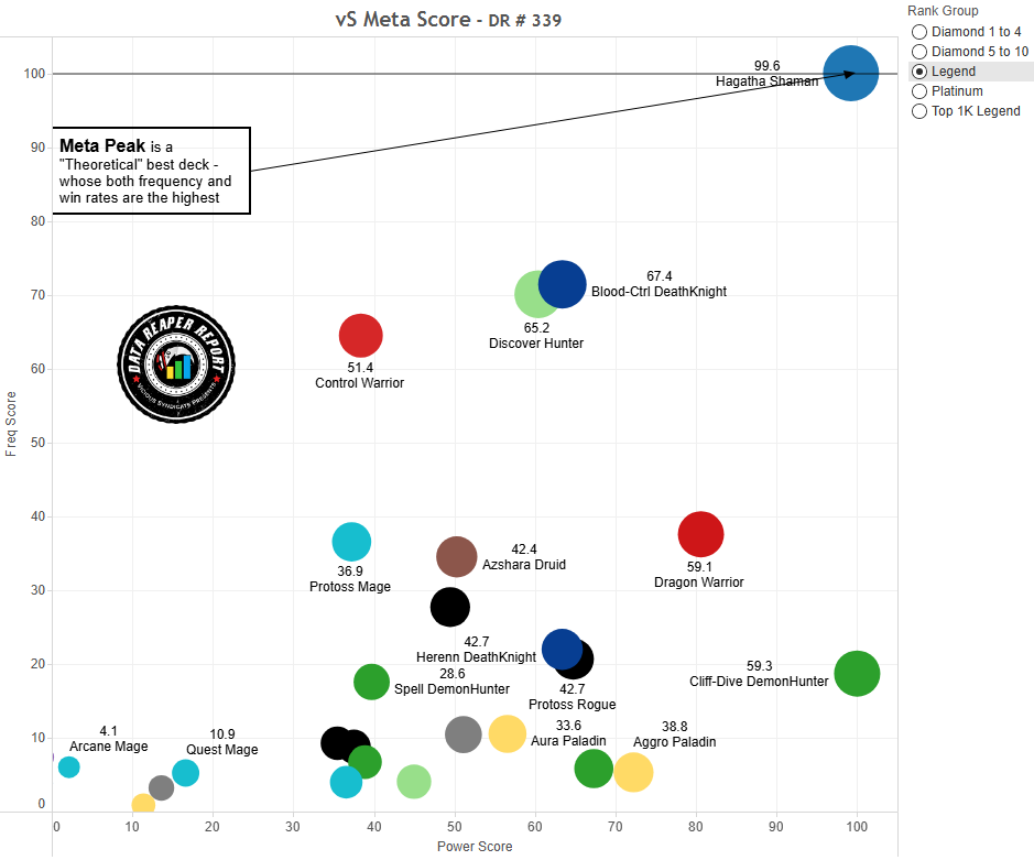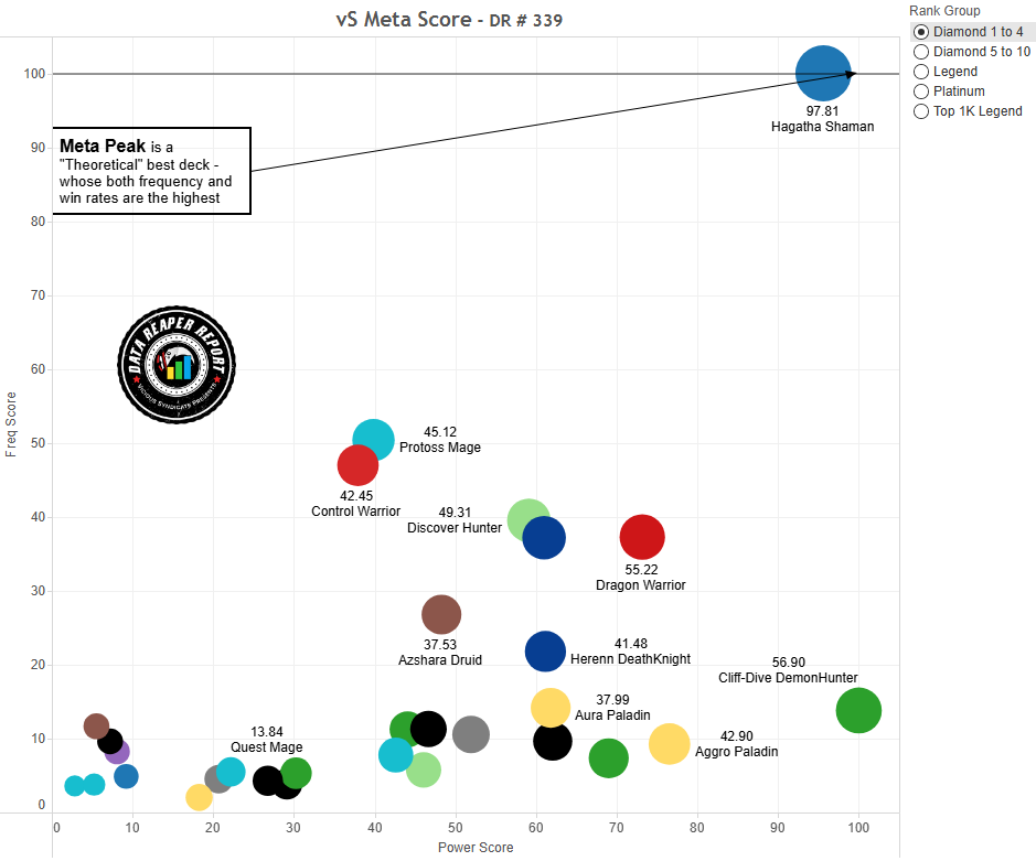 Оси диаграммы представляют оценку колод по шка ле от 0 до 100. Колода с наибольшим относительным винрейтом (см. предыдущую таблицу) получает оценку 100 по горизонтальной оси, а самая популярная — 100 по вертикальной. Оценку 0 получают колоды с противоположным значением от 50% винрейта/популярности. Например, если у сильнейшей колоды в мете 54% винрейта, то оценку 0 получат колоды с винрейтом 46%.