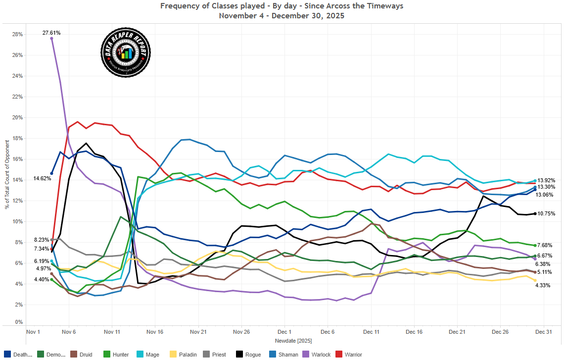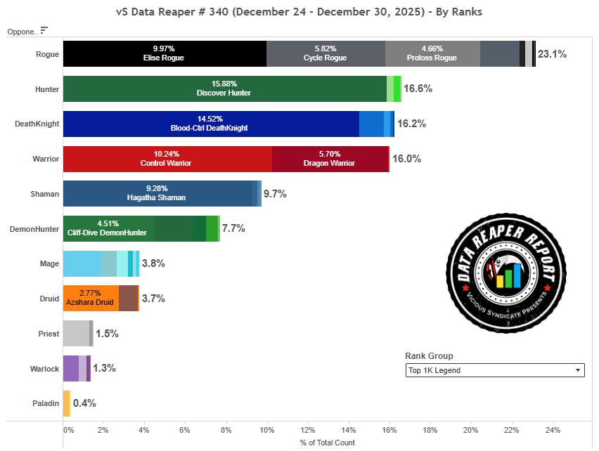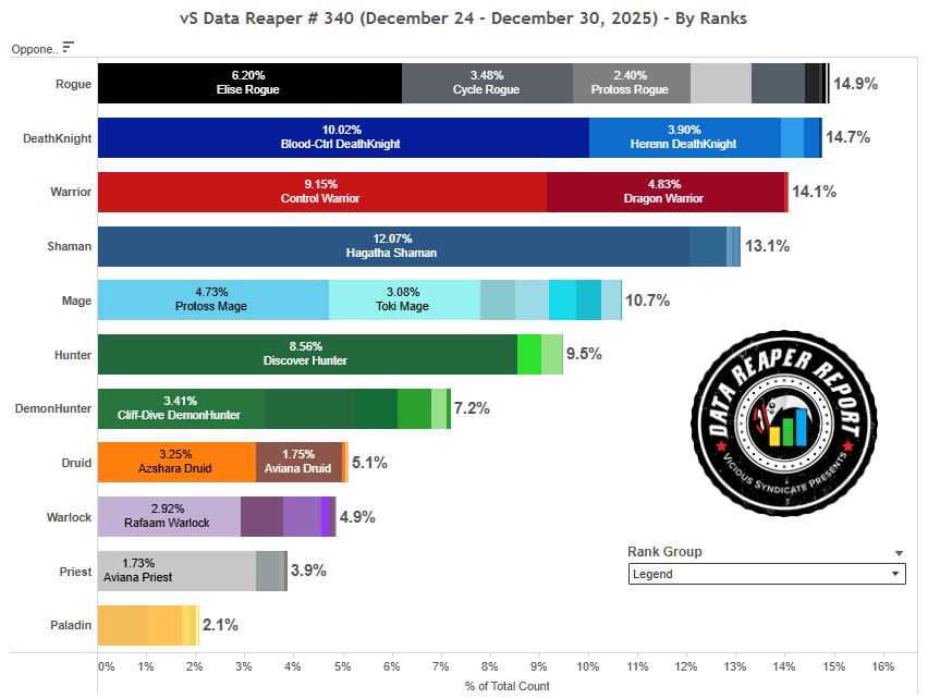 Элиза Разбойник совершил огромный прорыв, став одной из самых популярных колод в топе Легенды. Новый тренд постепенно распространяется и по другим рангам, хотя пиковая популярность наверняка останется именно на высших рангах. Миракл и Протосс Разбойники просели по числу.